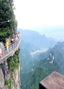 7日早上,我們來(lái)到了此行第一站——天門(mén)山。天門(mén)山海拔1500多米,因自然奇觀天門(mén)洞而蜚聲世界,被譽(yù)為“湘西第一神山”和“武陵之魂”。我們乘著觀光大巴沿著逶迤曲折的公路盤(pán)旋而上,只見(jiàn)壁立千仞,懸崖萬(wàn)丈,每逢轉(zhuǎn)彎,車(chē)內(nèi)一片驚呼,盡顯刺激與緊張。下車(chē)后,我們繼續(xù)前行,當(dāng)大家爬過(guò)999層階梯最終到達(dá)巨大的天門(mén)洞前時(shí),不禁感嘆大自然的鬼斧神工,神秘玄奇。往下眺望,林木蒼翠,山腳下的湖波像綠寶石一樣鑲嵌其中,美不勝收。清風(fēng)徐來(lái),令人神清氣爽,視野開(kāi)闊,豪氣頓生。天門(mén)山上的玻璃棧道,依峭壁凌空而建,讓人望而生畏,行而卻步。大家都小心翼翼,體驗(yàn)雙腳處于萬(wàn)丈深谷之上的驚險(xiǎn)。